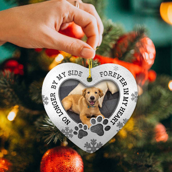 This is a beautiful ornament to remember your beloved pet. The touching line "No longer by my side, you left pawprint on my heart" seems to be the perfect assurance that you will cherish the memory you preserve of your pet and its most amazing photo forever. What a fantastic concept for Christmas tree ornaments!