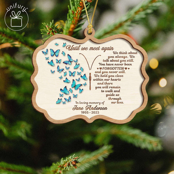 “Until We Meet Again” Memorial Customized Wooden Ornaments are a touching and durable tribute to cherished ones who have passed. Crafted from high-quality wood, these ornaments are etched with a poignant message and adorned with a flight of blue butterflies, symbolizing hope, transformation, and the enduring human spirit. The personalization option allows for the name of the loved one to be included, making each piece a unique and special keepsake. These ornaments offer a tangible connection to memories and a warm reminder that love transcends even the finality of death.