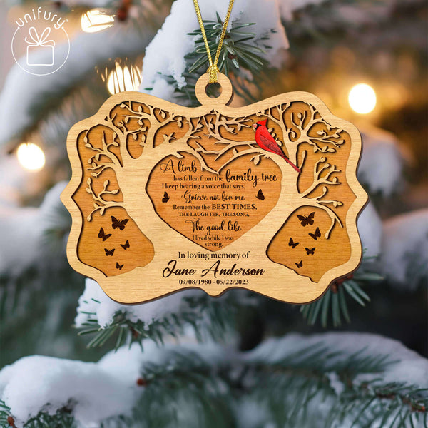 “A Limb Has Fallen” Memorial Wooden Ornaments Gifts are a poignant tribute to a lost family member. Made from high-quality wood, these ornaments show a delicate tree and cardinal design. This symbolizes both loss and the enduring presence of loved ones. The natural wood grain makes each piece unique, reflecting the spirit of the person remembered. With personalized engraving, these ornaments become more than decorations. They are lasting emblems of love and remembrance for the holidays and beyond.
