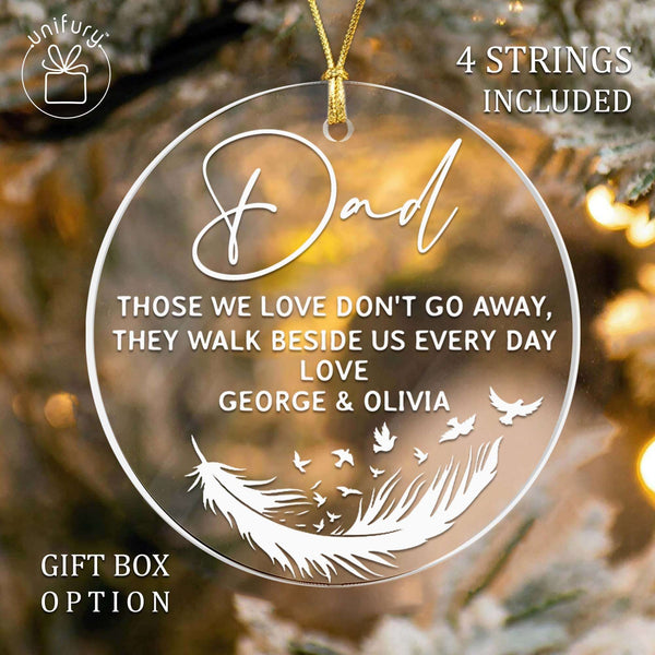 Dad Memorial Acrylic Ornament gifts for the loss of parents are a touching tribute to a beloved father. Made from high-quality, clear acrylic, this circular ornament is a durable and elegant memorial piece. It features a beautifully scripted "Dad" at the center, with the comforting words, "THOSE WE LOVE DON'T GO AWAY, THEY WALK BESIDE US EVERY DAY" etched below, serving as a gentle reminder of a father's enduring presence. The inclusion of personalized signatures, "LOVE GEORGE & OLIVIA," adds a tender personal touch. This ornament's special material allows it to reflect the warmth and lights of the holiday season, creating a luminous and heartfelt display that honors the memory of a missed parent. It's a meaningful keepsake that can bring comfort during the holidays and throughout the year.