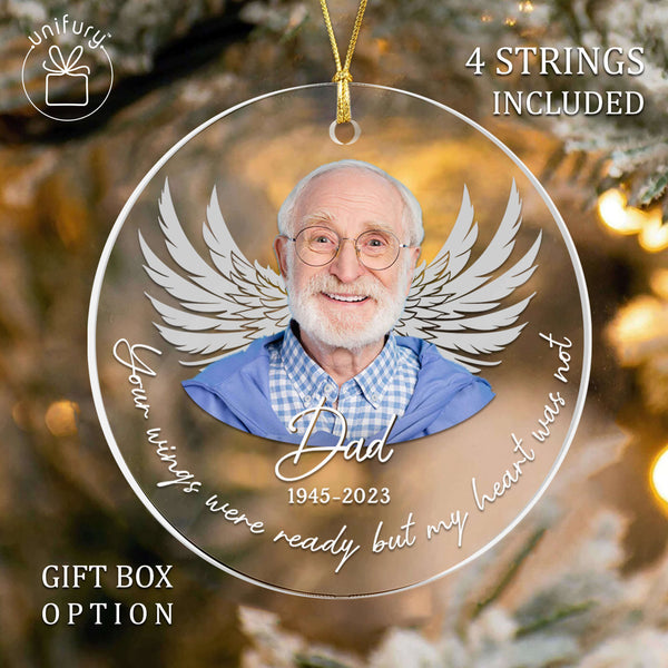 Customized Memorial Photo Acrylic Ornament is a heartfelt keepsake designed to honor the memory of a beloved father. Made from premium acrylic, this ornament is both clear and durable, allowing for a pristine display of a treasured photograph. The image of the father is beautifully framed by angelic wings and a golden halo, signifying his cherished presence and belief in a heavenly afterlife. Below the image, the text "Your wings were ready but my heart was not" adds a touching message of love and remembrance, alongside the years that mark a life well-lived. This ornament's personalized aspect, including the name "Dad" and the specific years, makes it an incredibly special gift for anyone mourning the loss of their parent. It's a way to keep their loved one's spirit close during the holidays and throughout the year.