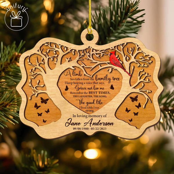 “A Limb Has Fallen” Wooden Ornaments Memorial gifts are a poignant and crafted tribute to a beloved parent who has passed. Intricately laser-cut from natural wood, this ornament captures the beauty and resilience of family connections through the symbolic family tree from which a limb has fallen. The detailed etching features a cardinal, a bird often associated with keeping the presence of lost loved ones close, and an empathetic poem that conveys the message of enduring love and cherished memories. The personalization with the loved one's name and significant dates adds an intimate layer, making each piece a unique keepsake. This special ornament, with its intricate details and touching sentiment, offers a comforting reminder of a parent's lasting legacy and the strength of family bonds.
