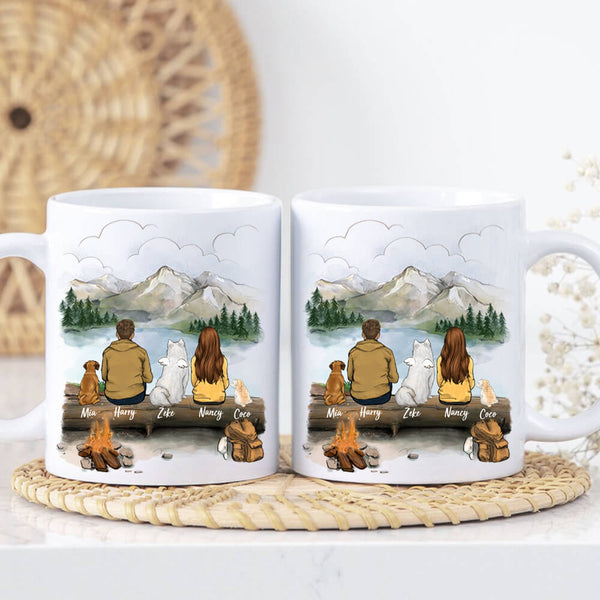 Hiking - The mountain dog mug ceramic coffee mug is a beautifully illustrated reminder of the serene moments shared with loved ones. Made from durable ceramic, this mug is perfect for sipping your favorite warm beverage while reminiscing about treasured memories. The front displays a heartfelt scene of companionship, featuring a group of friends and their loyal dogs gazing out over a mountain landscape, symbolizing the journey of life and the adventures shared. Each figure and dog is thoughtfully personalized with a name, making it a unique and cherished gift for anyone who has experienced the loss of a parent or seeks to celebrate the bond between humans and their canine friends. This special mug goes beyond a typical coffee cup, offering a daily dose of comfort and a reminder of the love that endures through shared experiences.
