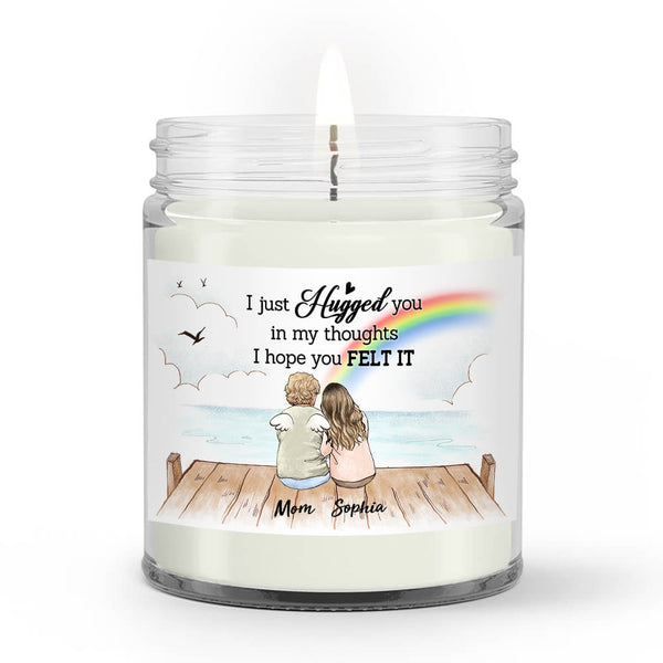 "I just hugged you in my thoughts" Memorial gifts Soy Wax Candle gifts are a warm and comforting way to honor the memory of a parent who has passed away. Crafted from eco-friendly soy wax, these candles burn cleanly and offer a gentle, flickering light that can bring solace during times of remembrance. The candle is encased in a simple glass jar that showcases a poignant illustration of two figures sitting on a dock, enveloped in a tender embrace by a rainbow - a universal symbol of hope and connection. The label is personalized with the names, adding an intimate touch to this memorial gift. Lighting this candle can create a peaceful space for reflection and a sense of closeness to a loved one, making it a special and heartfelt tribute.