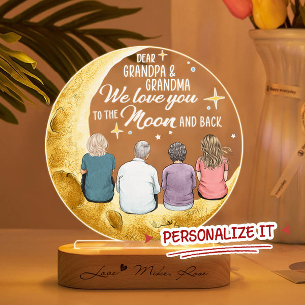 "Love You To The Moon And Back” Parents LED Night Light is a heartfelt and luminous tribute to parents who have passed away. This LED night light features a comforting, moon-shaped acrylic design that softly illuminates a personalized scene depicting family members looking up at the stars. Above them, the tender inscription "DEAR DAD & MOM, We love you to the moon and back" serves as a loving reminder of the boundless affection held for the departed. The light sits atop a wooden base where names or personal messages can be engraved, enhancing its significance as a memorial gift. It's not just a source of gentle light; it's a beacon of cherished memories that can be seen and felt every night.