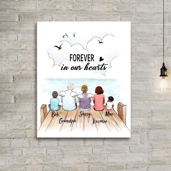 The personalized memorial canvas print gift is a touching tribute to the everlasting impact of loved ones who have passed. This high-quality canvas artfully depicts a serene scene of family members sitting on a pier, looking out towards the horizon, symbolizing the reflection on precious memories shared. Above the illustration, the message "Because someone we love is in heaven, there's a little bit of heaven in our home" offers comfort and the assurance that their presence is still felt. Names can be added to represent each family member, creating a truly personal piece. This canvas print stands out for its thoughtful design and the ability to evoke cherished moments, making it a special keepsake for anyone commemorating the loss of their parents.