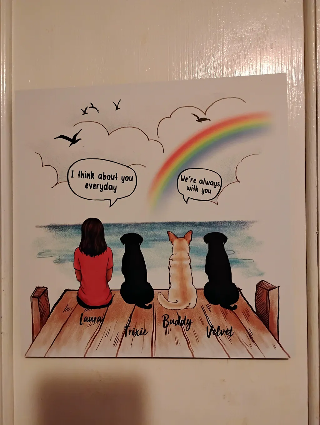 I have been wanting a watercolor print for a long time. We lost our hound recently and I looked for the right thing. Nothing worked. Customer service prompt replies and used our pictures to make this project perfect for our pack. Tail, coloring, sizes....Thank you!