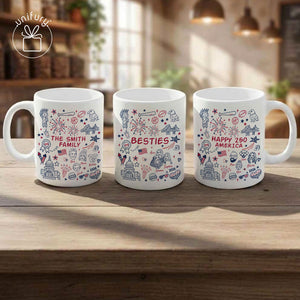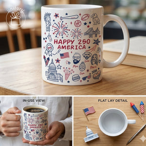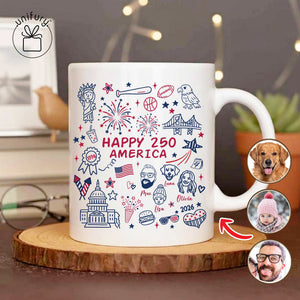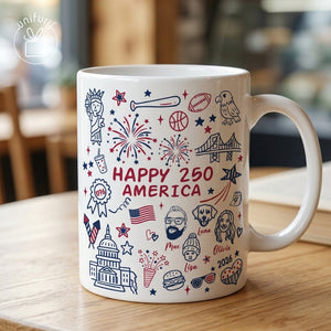 Start your morning with a dose of patriotism and a smile! This Custom Happy 250 America Mug celebrates the U.S. Sestercentennial in 2026. Featuring personalized lineart of your loved ones, even your pets, this mug is surrounded by hand-drawn doodle icons of American pride.