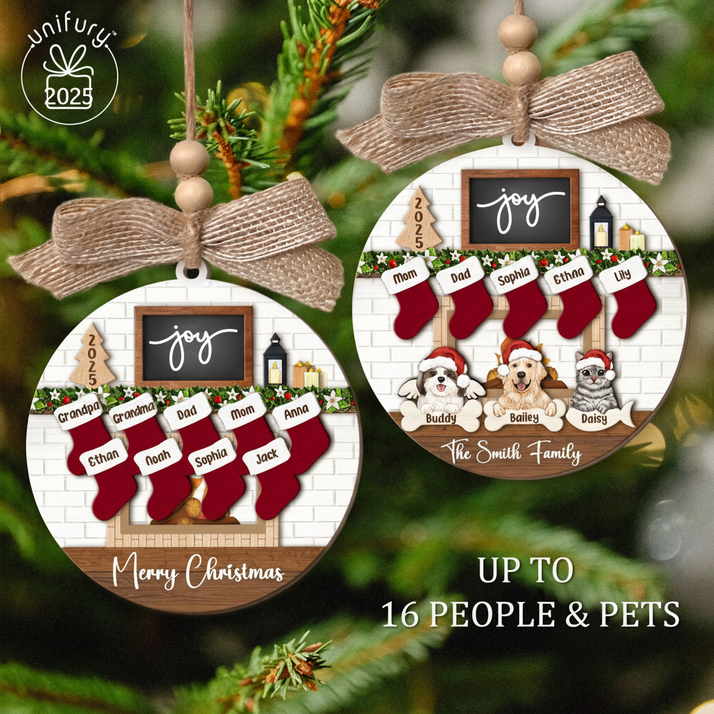 Warm up your holiday season with the "Family With Dog Cat Fireplace" 3D Wooden Ornament. This beautifully crafted ornament features a cozy fireplace scene, complete with your personalized family, dog, and cat. It’s a perfect keepsake that adds a personal and heartwarming touch to your holiday decor.
