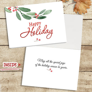 The design features a clean, bright white background accented by beautiful, contemporary watercolor artwork of a holly and berry sprig. The outside of the card carries the cheerful message, "Happy Holiday," written in an elegant, festive red script.